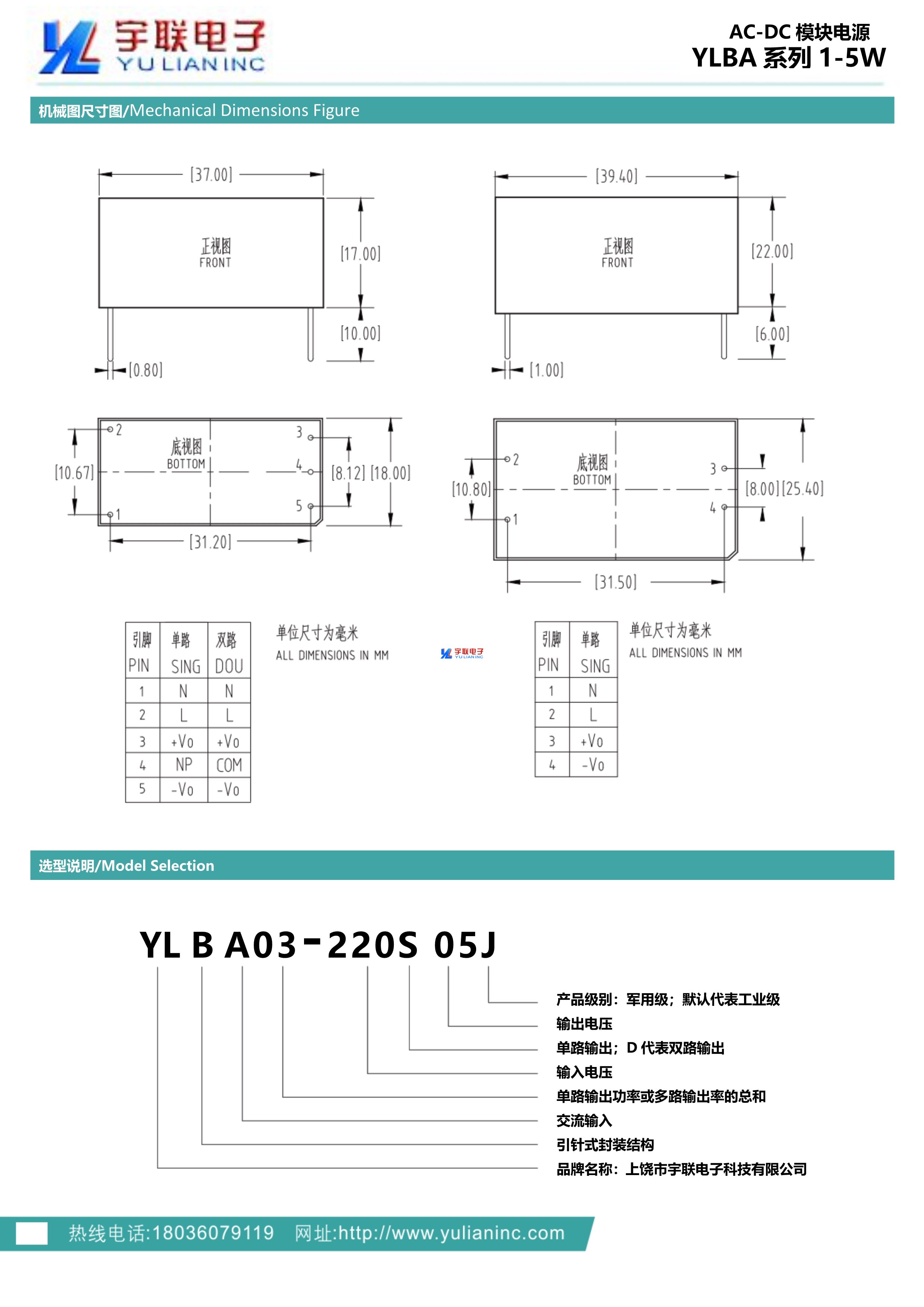 ● 功率:1-5W 单路功率可达5W ● 输入范围:85-265V 176-265V 85-420V ● 输出电压:3.3V 5V 12V 15V 24V 48V 110V等 ● 输出路数:单路 双路 ● 防护:防振 防尘 防盐雾 ● 尺寸:37x18.5x16.5mm 39x25x22mm(5...